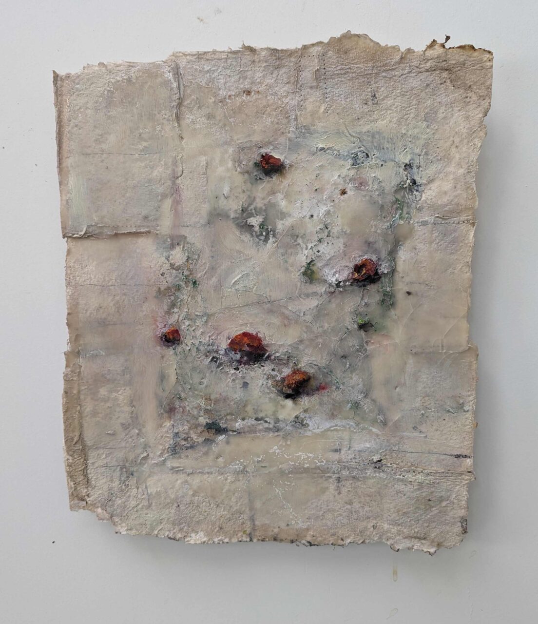 32 x 40 cm, geschept papier, plastics, bijenwas, olieverf